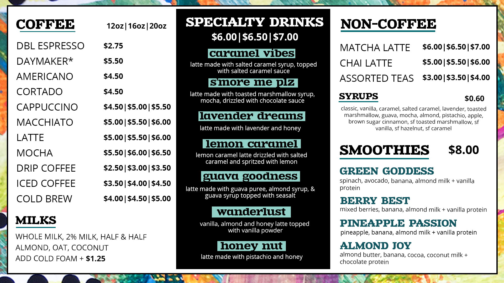Our new seasonal menu designed to guide you through the transition of fall, each sip layers cozy warmth and bold flavors hand crafted for lingering afternoons, crisp evenings, and everything in between.