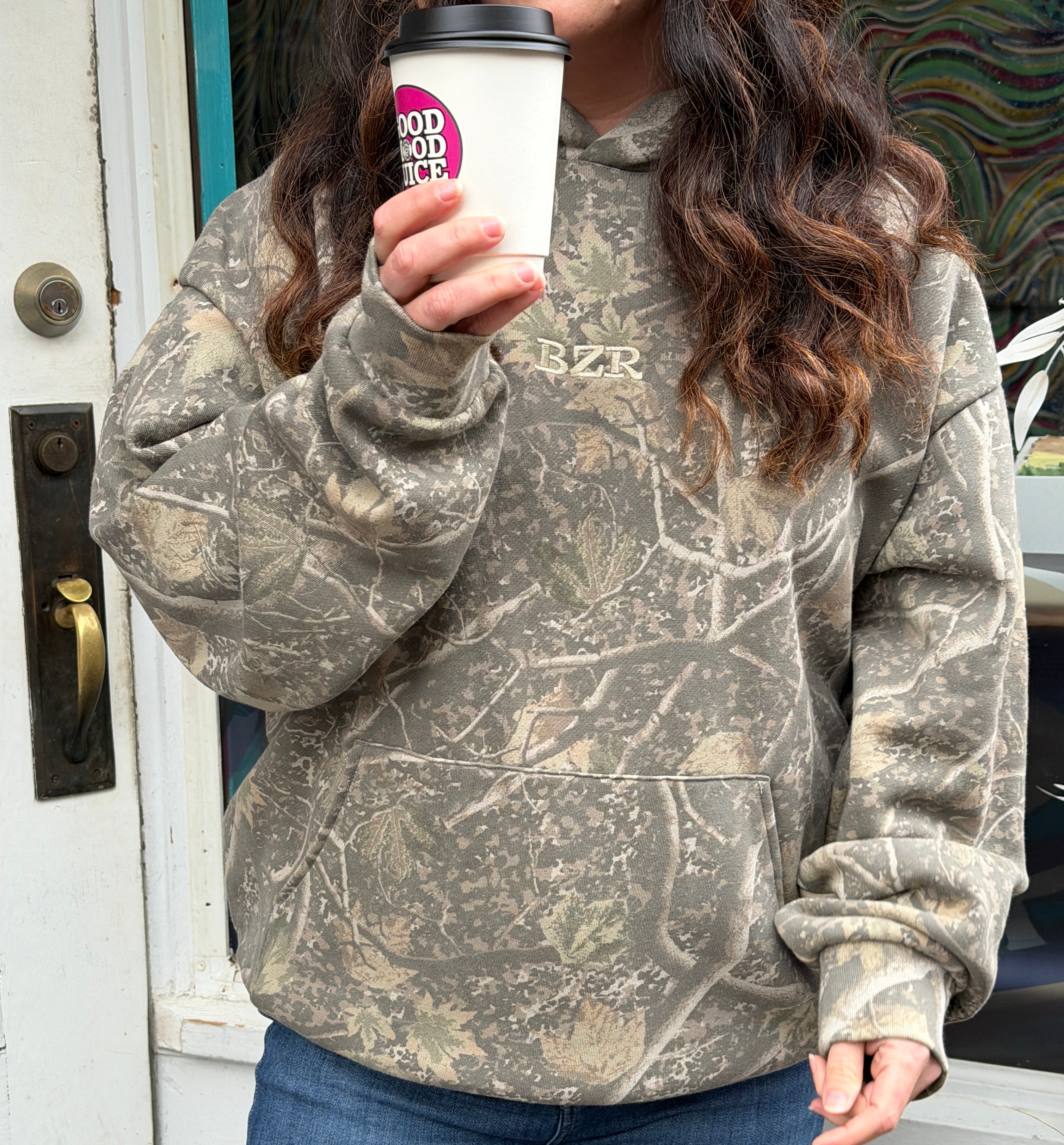 Soft as a cloud with a subtle, trendy camo print. The BZR Camo Hoodie is for blending in while still standing out. A relaxed fit with subtle front BZR embroiderey and a distressed statement back design. The kind of hoodie that will quickly become your everyday favorite.